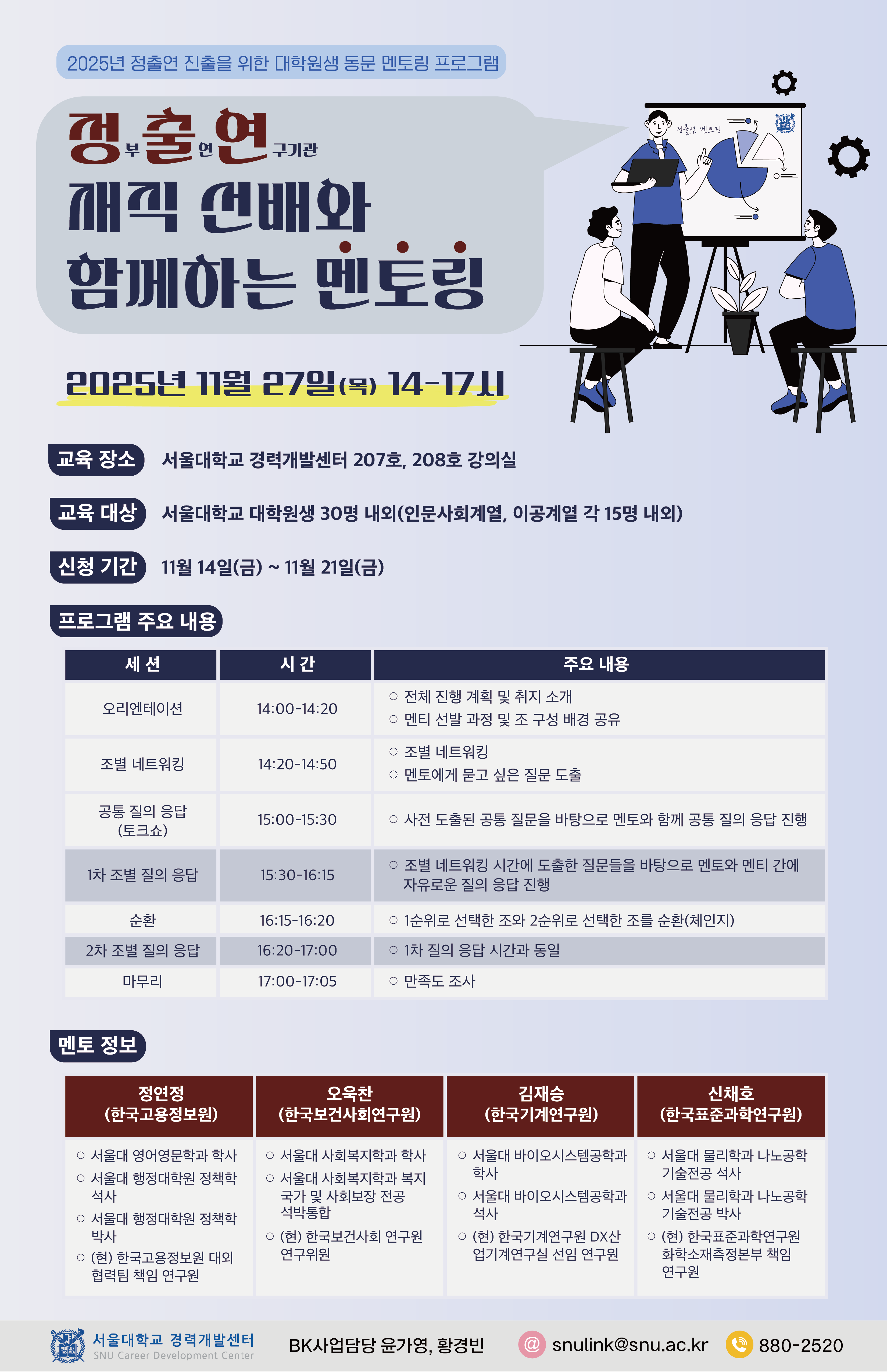 | 제목 | [모집] 정출연 재직 선배와 함께하는 대학원생 동문 멘토링 | ||||