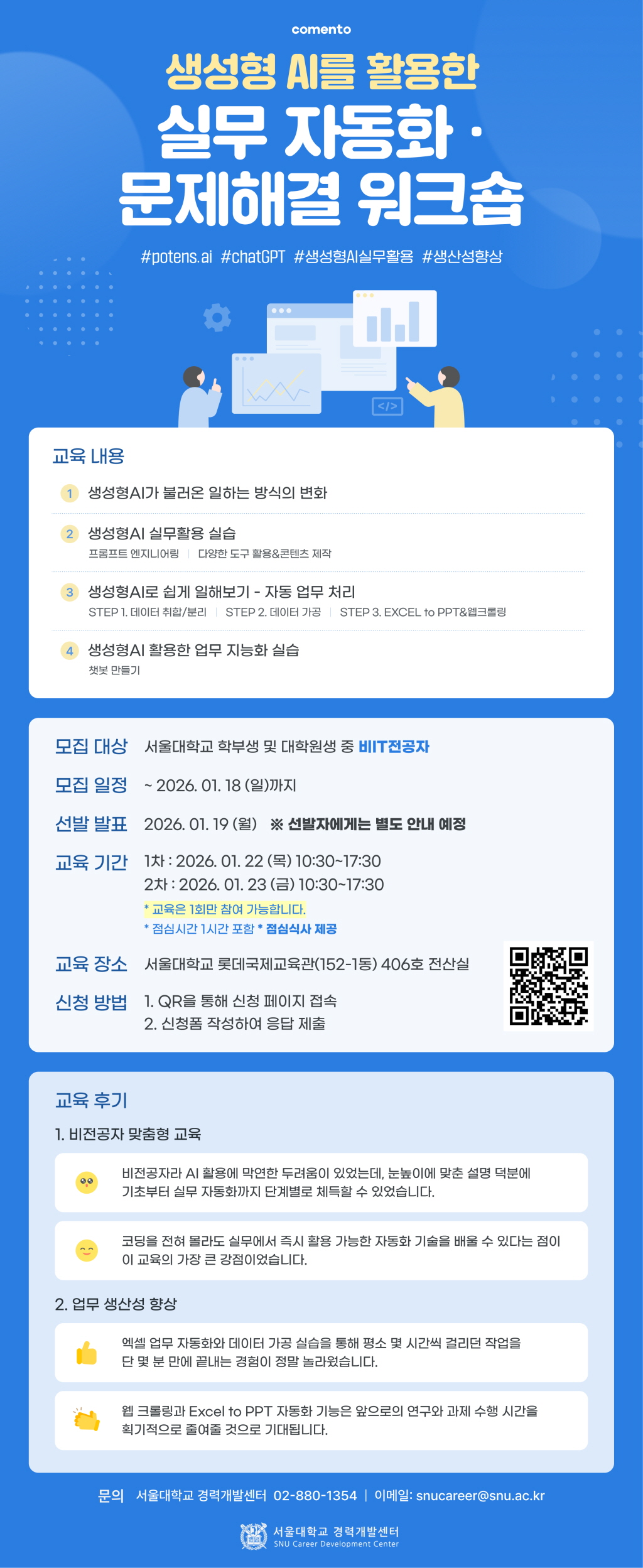 | 제목 | [모집] 생성형 AI를 활용한 실무 자동화·문제해결 워크숍(~1/18(일)까지) | ||||