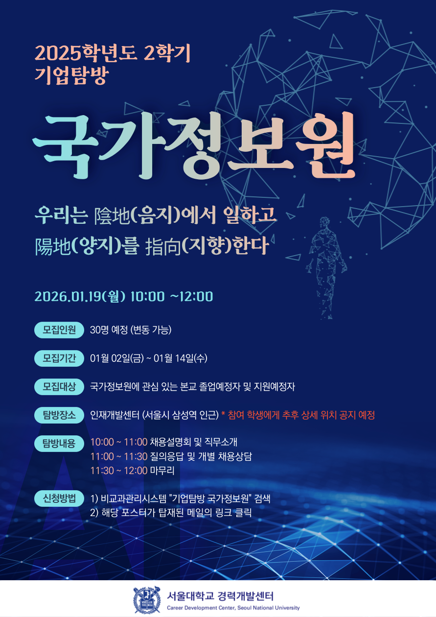 ■ 일정: 2026. 01. 19.(월) 10:00~13:00 ■ 장소: 삼성역 인근 (위치 추후 재공지) ■ 신청 기간: 2026. 01. 02. (금) ~ 2026. 01. 14. (수) 23:59까지 ■ 신청 자격: 국가기관 중 "국가정보원"에 실제 지원하고자 하는 학부생 및 대학원생 ■ 신청 링크: extra.snu.ac.kr/ptfol/pgm/view.do?dataSeq=PGM012001466 ■ 문의: 경력개발센터(02-880-1359, snucareer@snu.ac.kr) *신청 과정에 문제가 발생하는 경우 이름, 학번, 전화번호를 snucareer@snu.ac.kr 로 보내주시길 바랍니다.