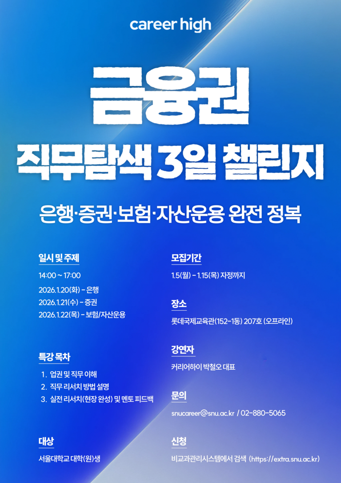 「금융권 직무탐색 챌린지 (은행·증권·보험·자산운용 완전 정복)」 프로그램 안내안녕하세요, 서울대학교 경력개발센터입니다. 경력개발센터에서는 금융권 취업을 준비하는 학생들을 대상으로 은행·증권·보험·자산운용 등 금융권 주요 업권과 직무를 체계적으로 탐색할 수 있는 3일 집중형 직무탐색 프로그램을 운영합니다. 본 프로그램은 직무에 대한 이해를 넘어, 실제 채용 준비에 활용할 수 있는 직무 리서치 방법을 배우고 현장에서 직접 적용해보는 실습 중심 특강으로 구성되어 있습니다. 금융권 직무 선택과 준비 방향 설정에 고민이 있는 학생들의 많은 참여를 바랍니다. 프로그램 개요
