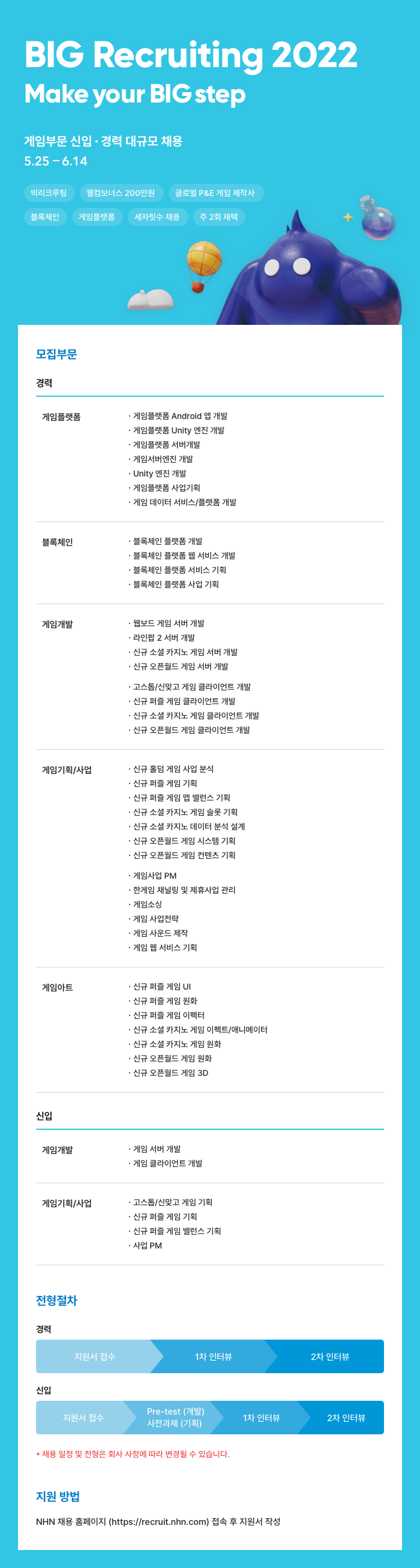 | Subject | [NHN Bigfoot] 2022 게임부문 신입 (개발/기획/사업) 공개채용 | ||