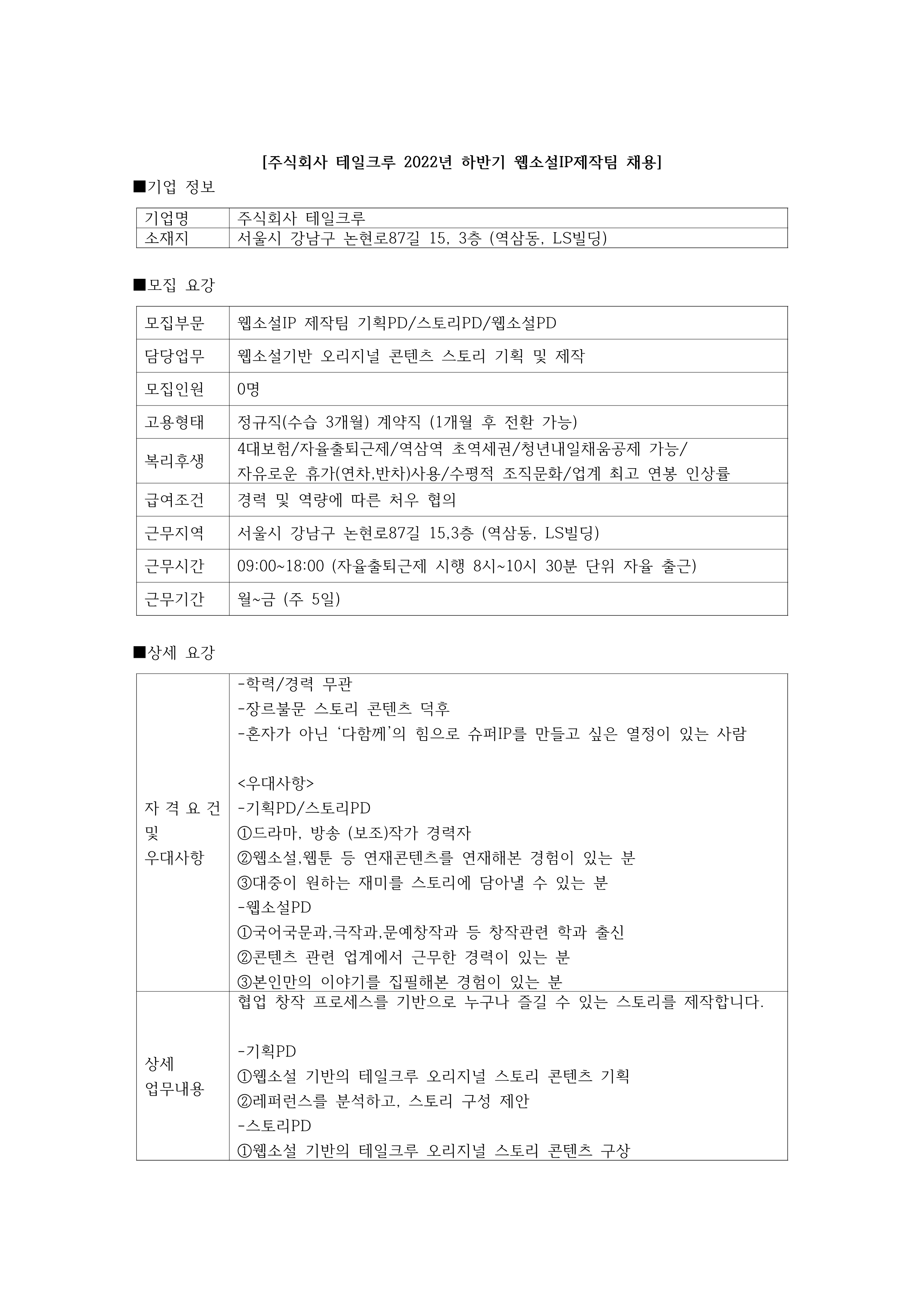 | Company Name | 주식회사 테일크루 | Date Posted | 2022-06-28 |
