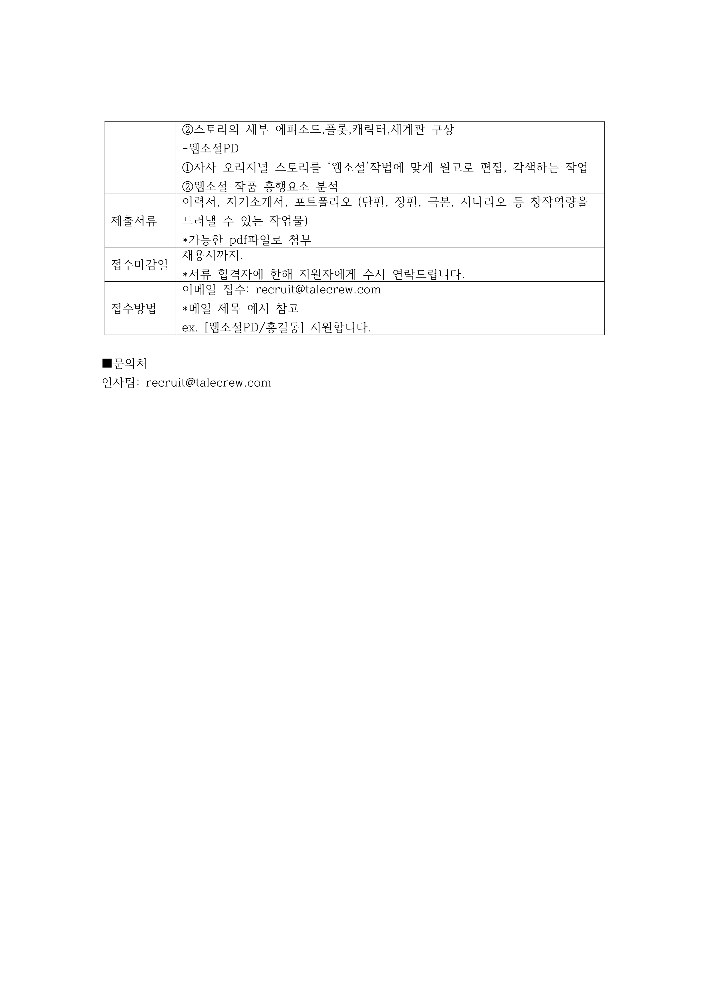| Subject | 웹소설IP제작팀 스토리 콘텐츠 창작자 모집 | ||