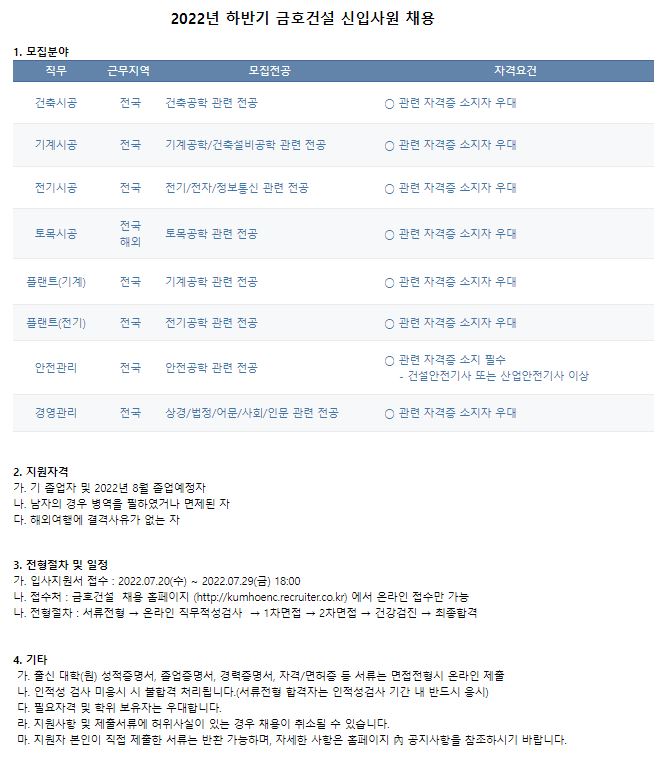 | Subject | 2022년 하반기 금호건설 신입사원 채용 | ||