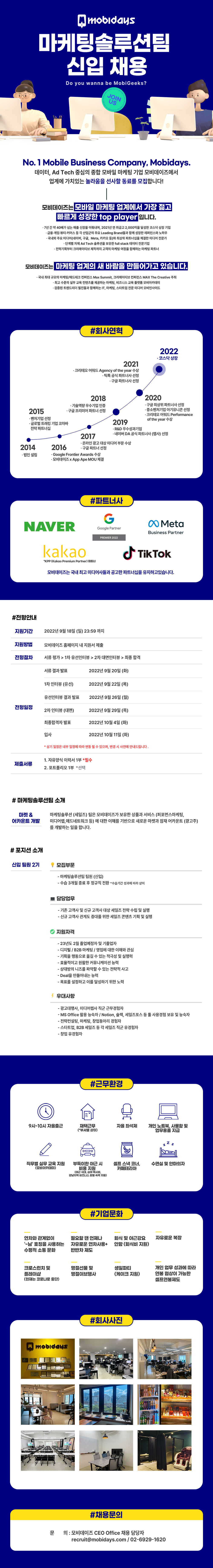 | Subject | [모비데이즈] 세일즈 (광고영업, 마케팅솔루션팀) 정규직 신입 팀원 채용 (9/18 마감) | ||