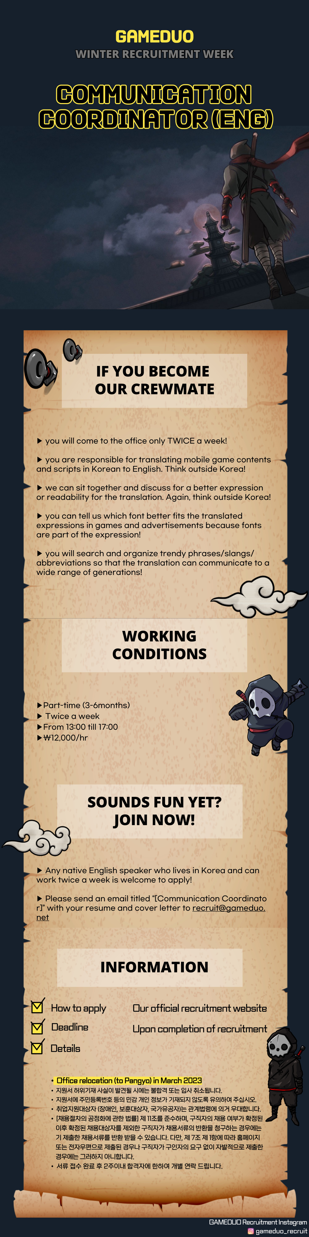 | Company Name | 게임듀오 | Date Posted | 2022-12-14 |