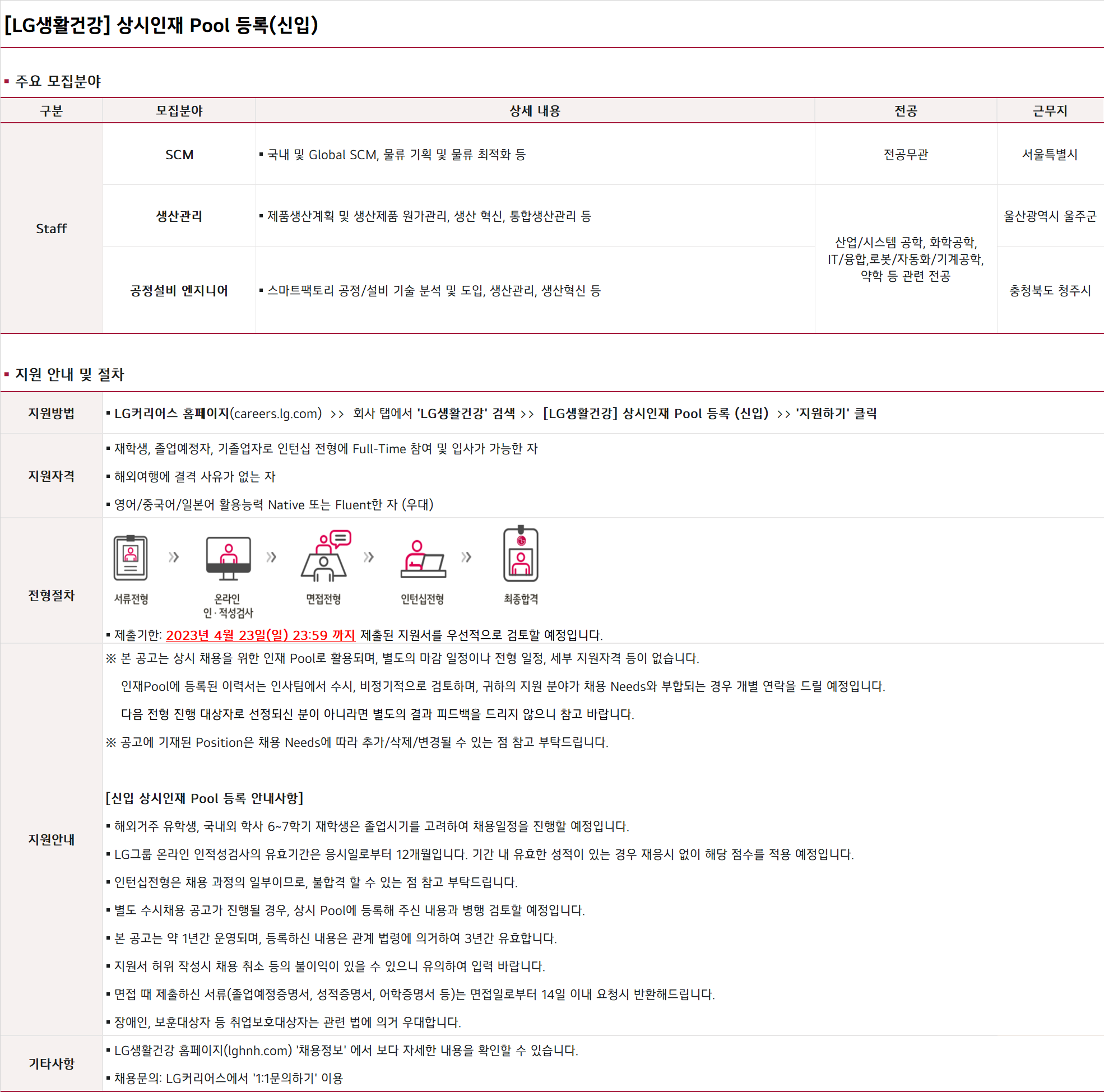 | Subject | [LG생활건강] 신입사원모집 공고(SCM/생산관리/설비기술) | ||