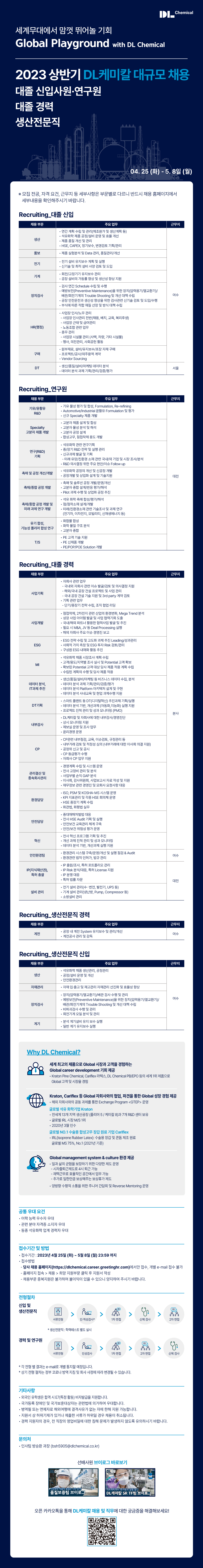 | Subject | DL케미칼 · 2023 상반기 대졸 신입사원·연구원 / 대졸 경력 / 생산전문직 채용 | ||