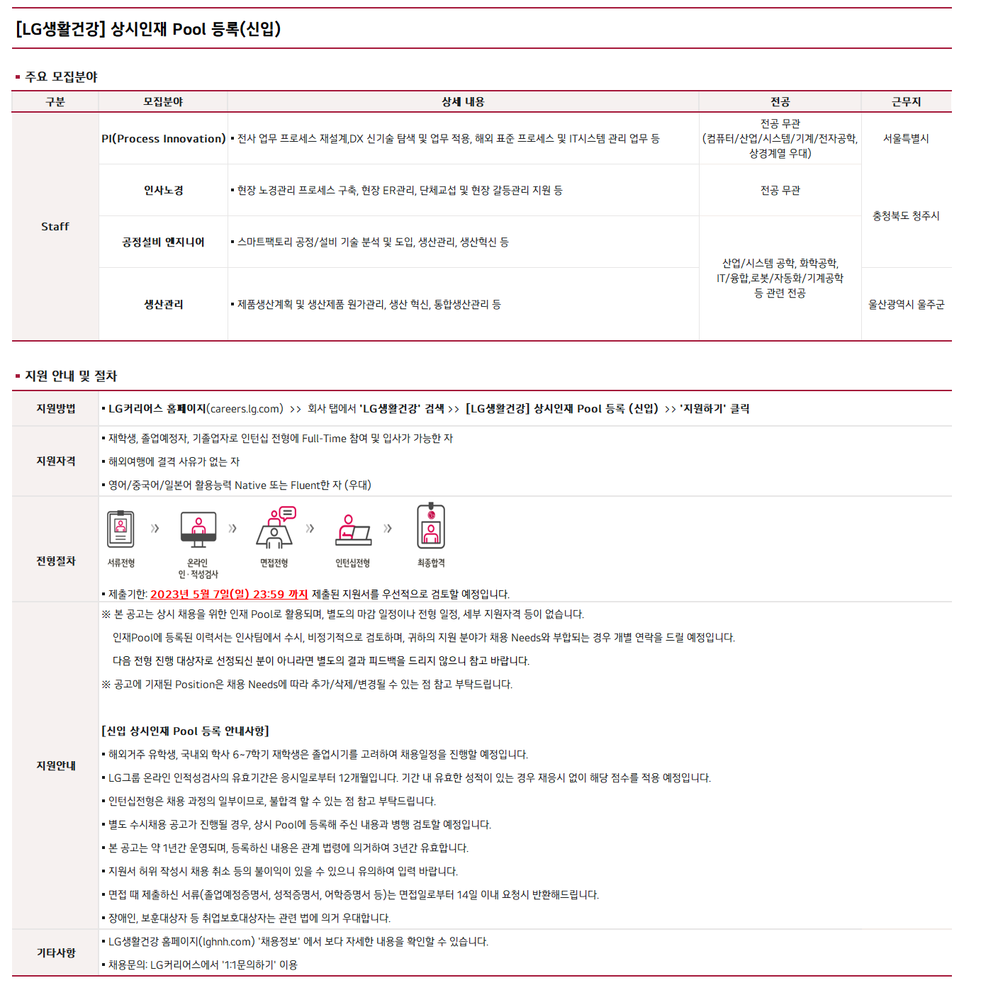 | Subject | [LG생활건강] 신입사원 모집(PI/인사노경/생산관리/공정설비 엔지니어) | ||