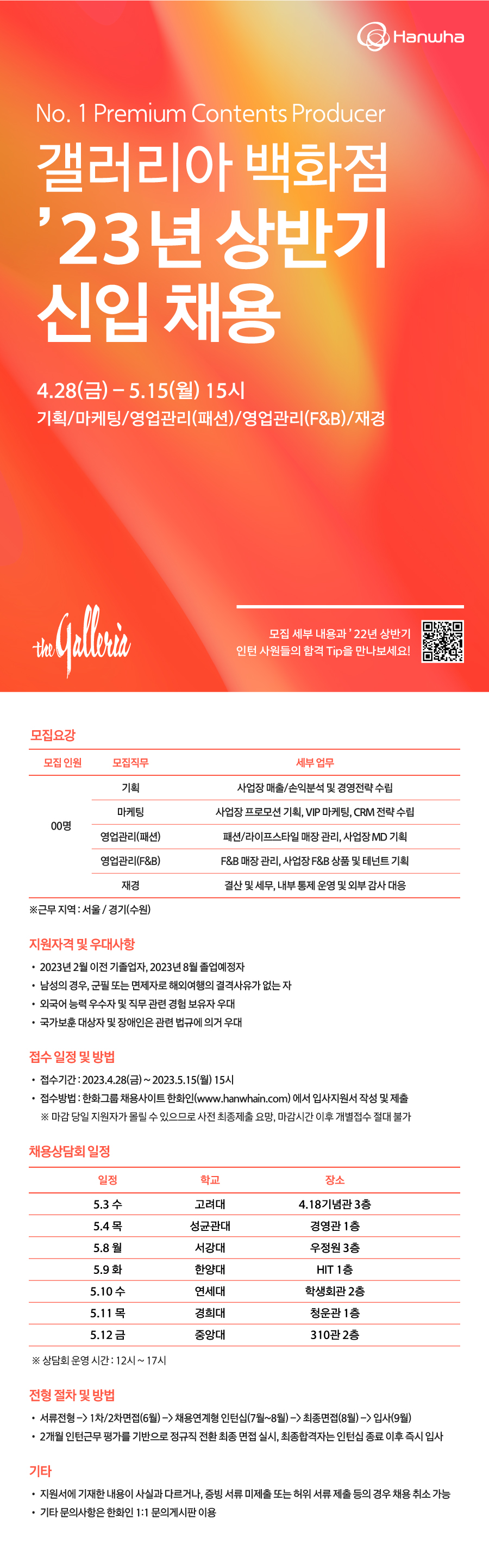 | Company Name | 한화갤러리아 | Date Posted | 2023-04-28 |