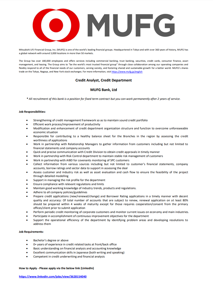 | Subject | [MUFG Bank] Credit Analyst모집 | ||