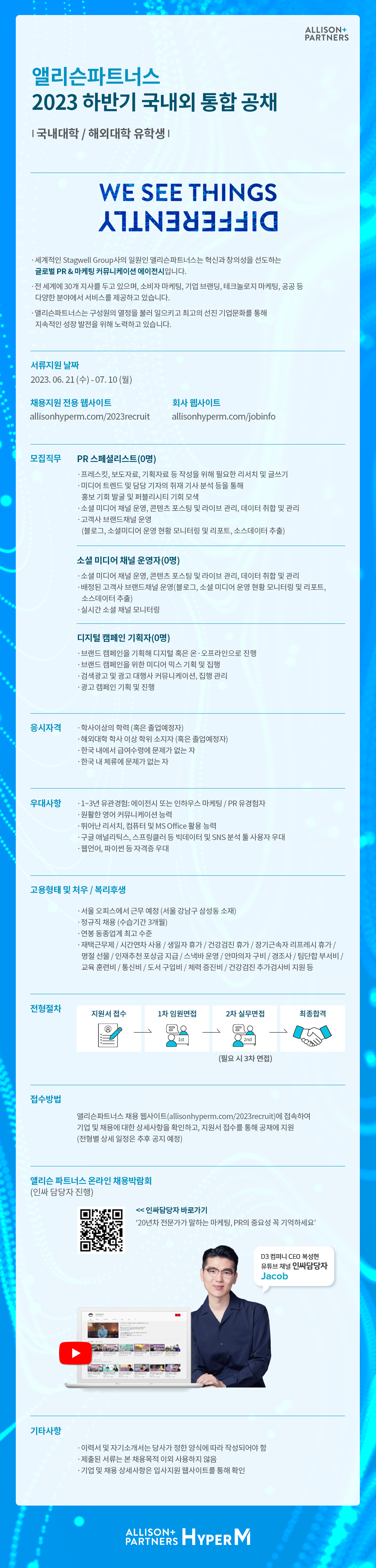 | Subject | [앨리슨파트너스] 2023 하반기 국내외 통합 공채 (국내/해외대학) | ||