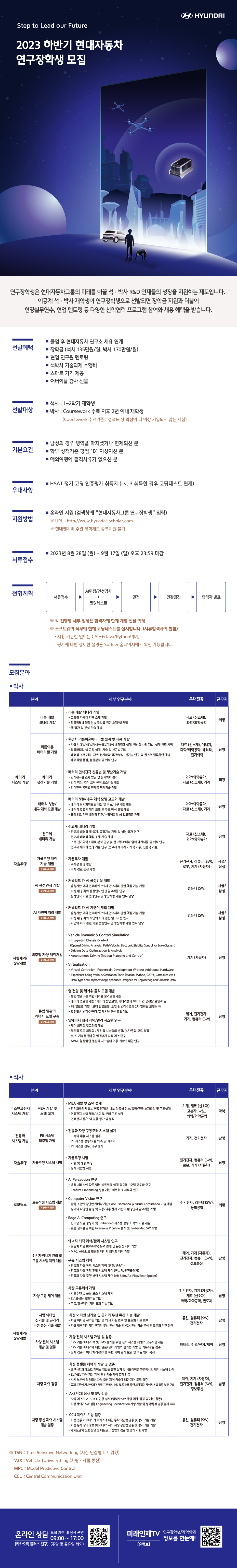 | Subject | 2023 하반기 현대자동차 연구장학생/계약학과 모집 | ||