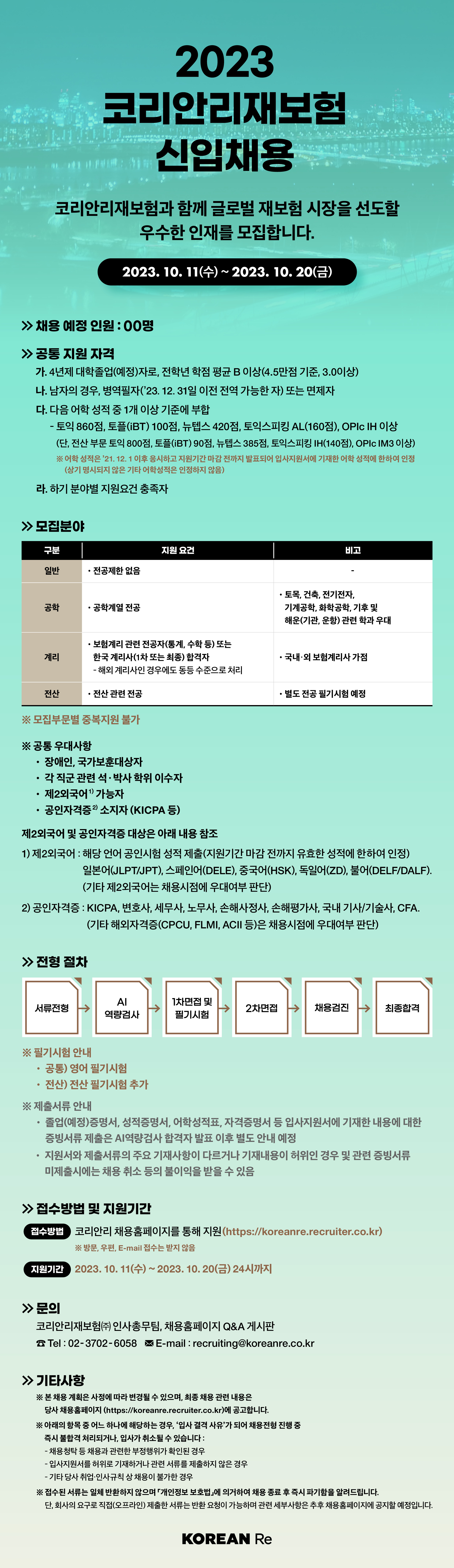 | Subject | 2023 코리안리재보험 신입사원 채용공고 | ||