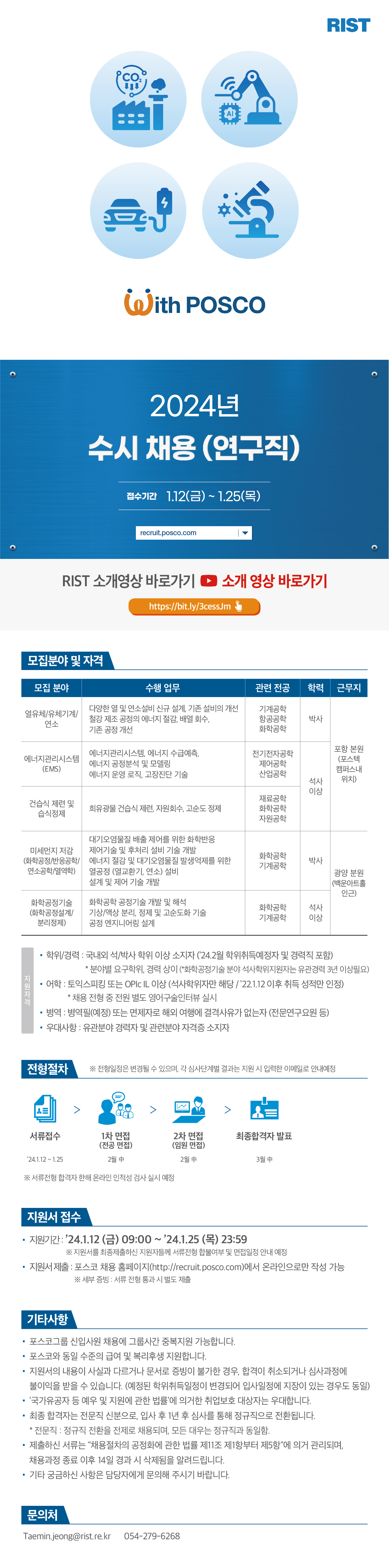 | Subject | [포스코그룹] RIST 연구직 수시 채용 공고 | ||