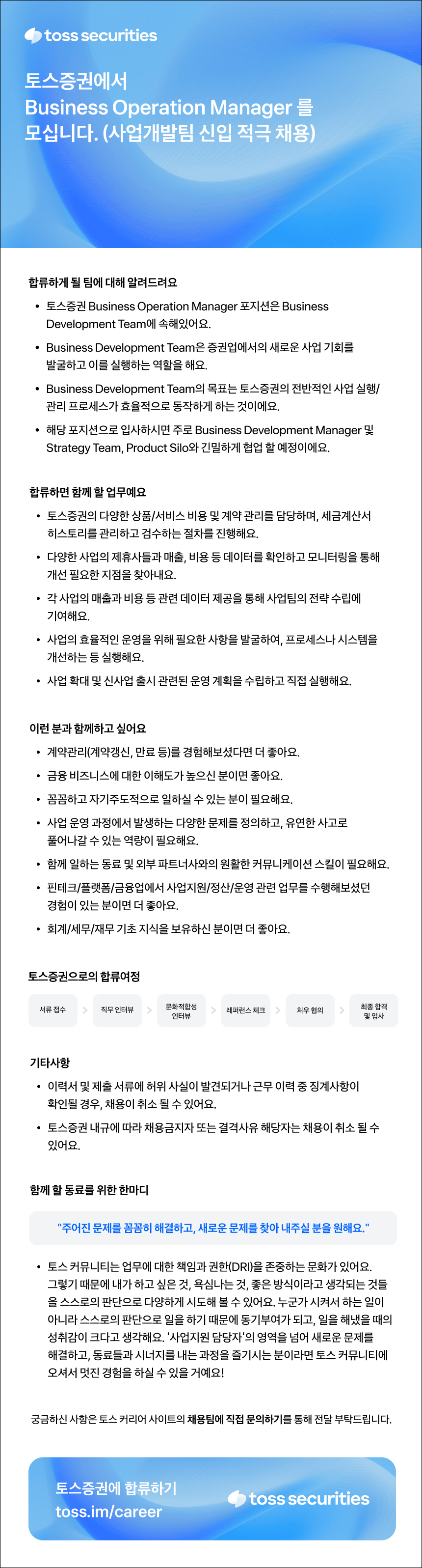 | Subject | 토스증권 Business Operation Manager (사업개발팀 신입) 채용 | ||