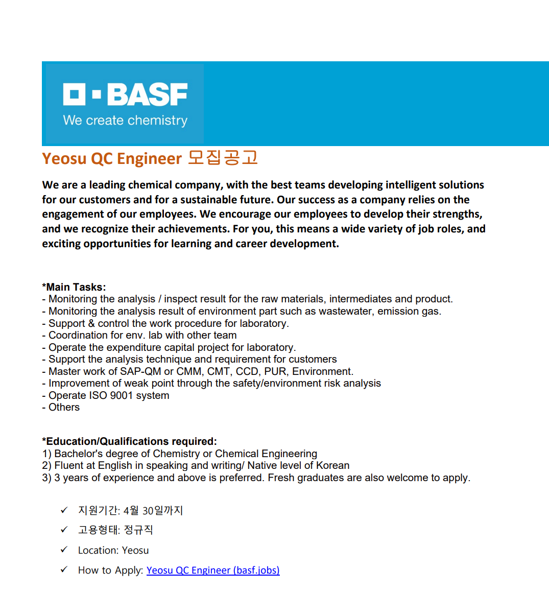 | Subject | [한국바스프] 여수 QC Engineer 모집 | ||
