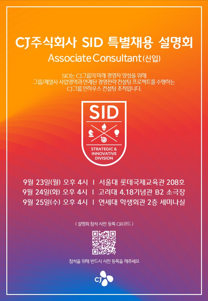 CJ의 미래를 이끌어갈 인재를 조기 확보/육성하기 위한 인재 양성소 그룹 인하우스 컨설팅 조직 SID(Strategic & Innovative Division) 특별채용 설명회를 진행합니다.