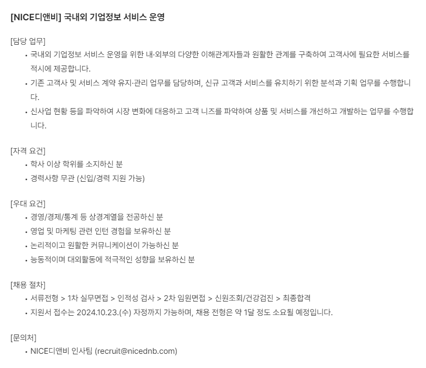 | Company Name | 나이스디앤비 | Date Posted | 2024-10-14 |