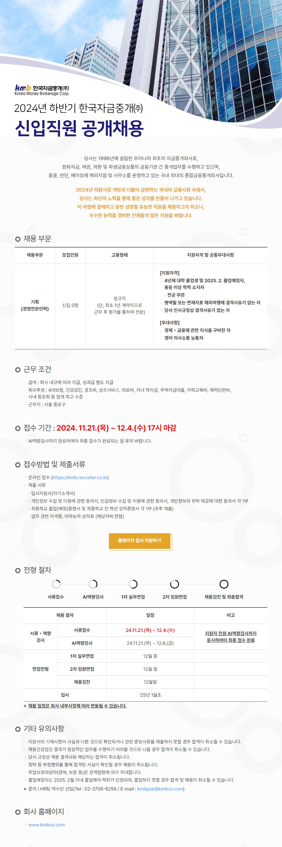| Subject | [한국자금중개(주)] 2024년 하반기 신입직원 공개채용 (경영기획) | ||