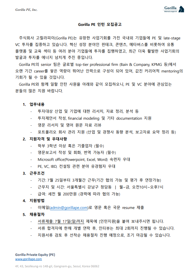 | Subject | Gorilla PE 인턴 모집공고 | ||