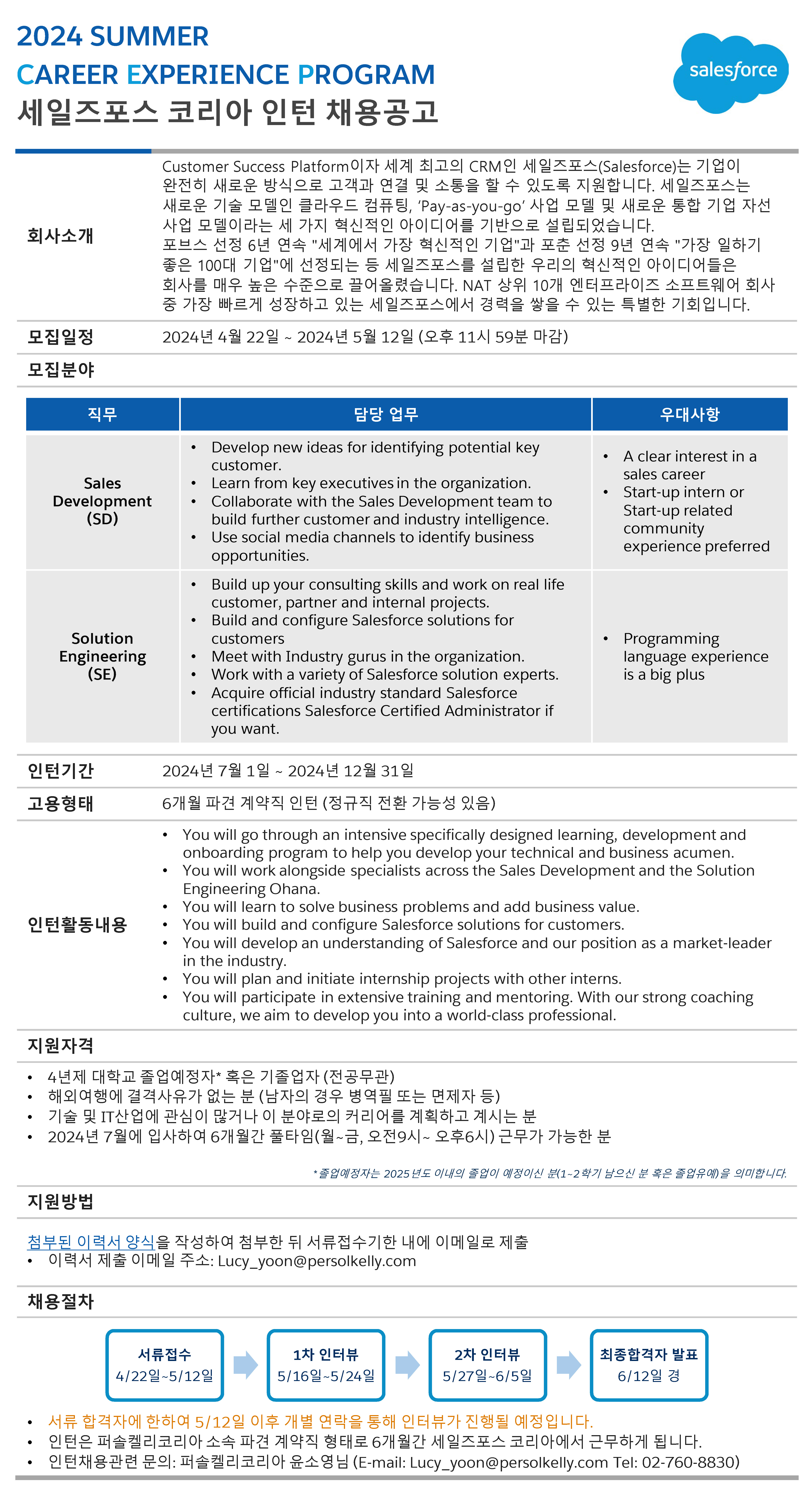| Subject | [세일즈포스 코리아] 2024 하반기 인턴 채용 (2024 Summer Career Experience Program) | ||