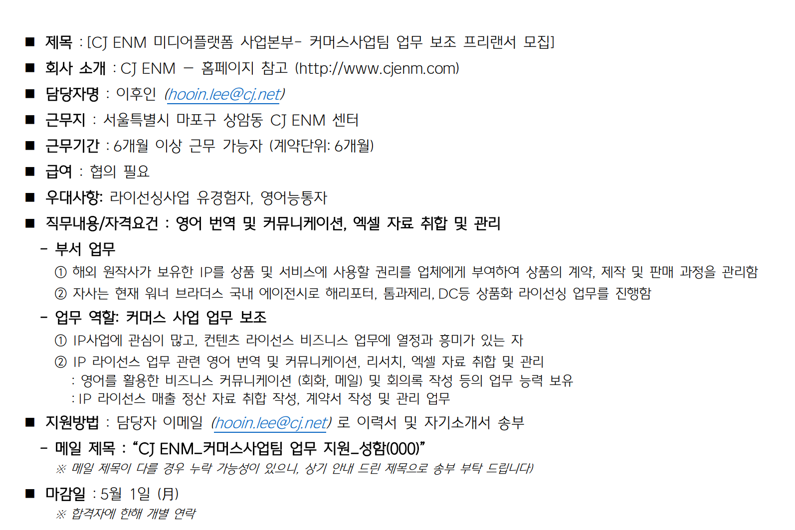 | Subject | [CJ ENM] 커머스사업팀 프리랜서 모집공고 | ||